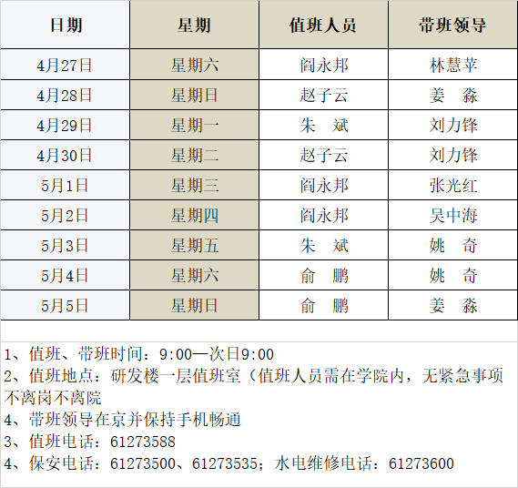 软件与微电子学院2024年劳动节放假期间值班表