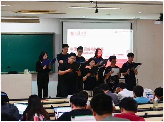未名三苑党支部书记黄世龙同志为大家讲解解放思想、锐意进取的改革开放和社会主义现代化建设新时期。在这段时期,我们党涌现了一大批解放思想、锐意进取的伟大建党精神,分别是改革开放精神、抗击非典精神、劳模精神、特区精神、抗震救灾精神、青藏铁路精神、抗洪精神、载人航天精神、女排精神等。紧接着,燕南三苑表演了节目红歌合唱《唱支山歌给党听》。
