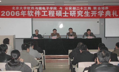 11月21日下午,北京大学软件与微电子学院与公安部二十三局联合培养2006年软件工程硕士研究生开学典礼在大兴校区召开。会议由吴中海副院长主持,公安部信息通信局局长赵大斌在在开学典礼上作了重要讲话,学院党委书记、副院长白志强教授为开学典礼致辞,教师代表杨雅辉副教授和学生代表也在开学典礼上作了发言,公安部信息通信局总工程师马晓东等有关领导出席了会议。