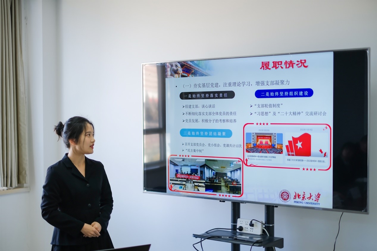 2022级MEM一苑党支部书记王茂洁、2022级燕南四苑党支部书记刘帅龙主持会议,对2022年度学院党支书的总体工作情况进行介绍。