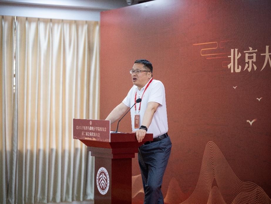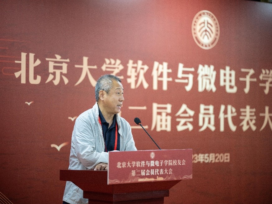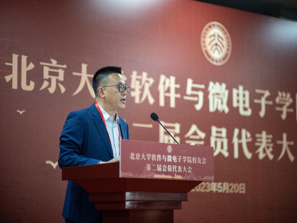 李存峰代表北京大学校友工作办公室致辞。他指出,北京大学软件与微电子学院成立二十余年以来,艰苦创业、改革创新、为党育人、为国育才,在各行各业涌现了一大批卓越校友,为北大争光,为软微添彩。今天第二届会员代表大会的举行,标志着学院校友工作开启了新的篇章。北京大学校友工作办公室将一如既往地服务和支持学院校友工作的开展。